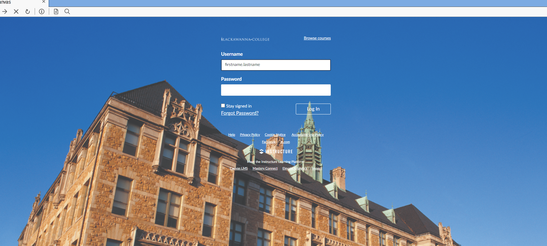 - On the Canvas log in screen, you will need to log in with your Lackawanna College username. (Everything before the @ in your email address)